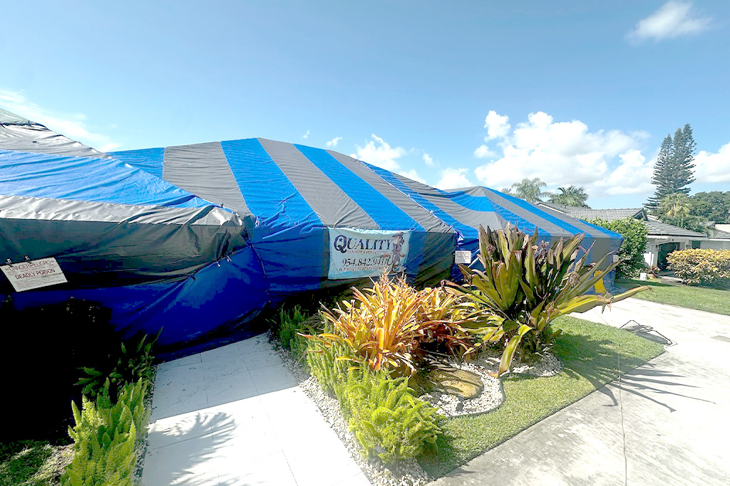 Structural fumigation is a pest control mechanism that involves filling the airspace within a structure with toxic gas. A tarp, or tent is put in place to cover the structure and contain the gas inside. The gas then works quickly to penetrate the cracks, crevices, and pores in the wood to completely eradicate pests such as drywood termites and bed bugs. Once the tarp is removed, fans are brought out to help the gas escape. There’s no need to worry about whether any left- over residue will remain in the property, because this process is carried out with a level of accuracy and attention to detail to ensure that this does not occur. All of the active ingredients used during structural fumigations in South Florida have been fully approved and can only be used by certified operators. Luckily for you, our team is comprised of certified, knowledgeable and experienced individuals who have been working in the pest control industry for years, and who count with the proper training to carry out any kind of structural fumigation, along with other commonly used pest control services. We provide each and every one of our technicians with the most advanced tools and resources to complete the job in a methodical and effective manner.